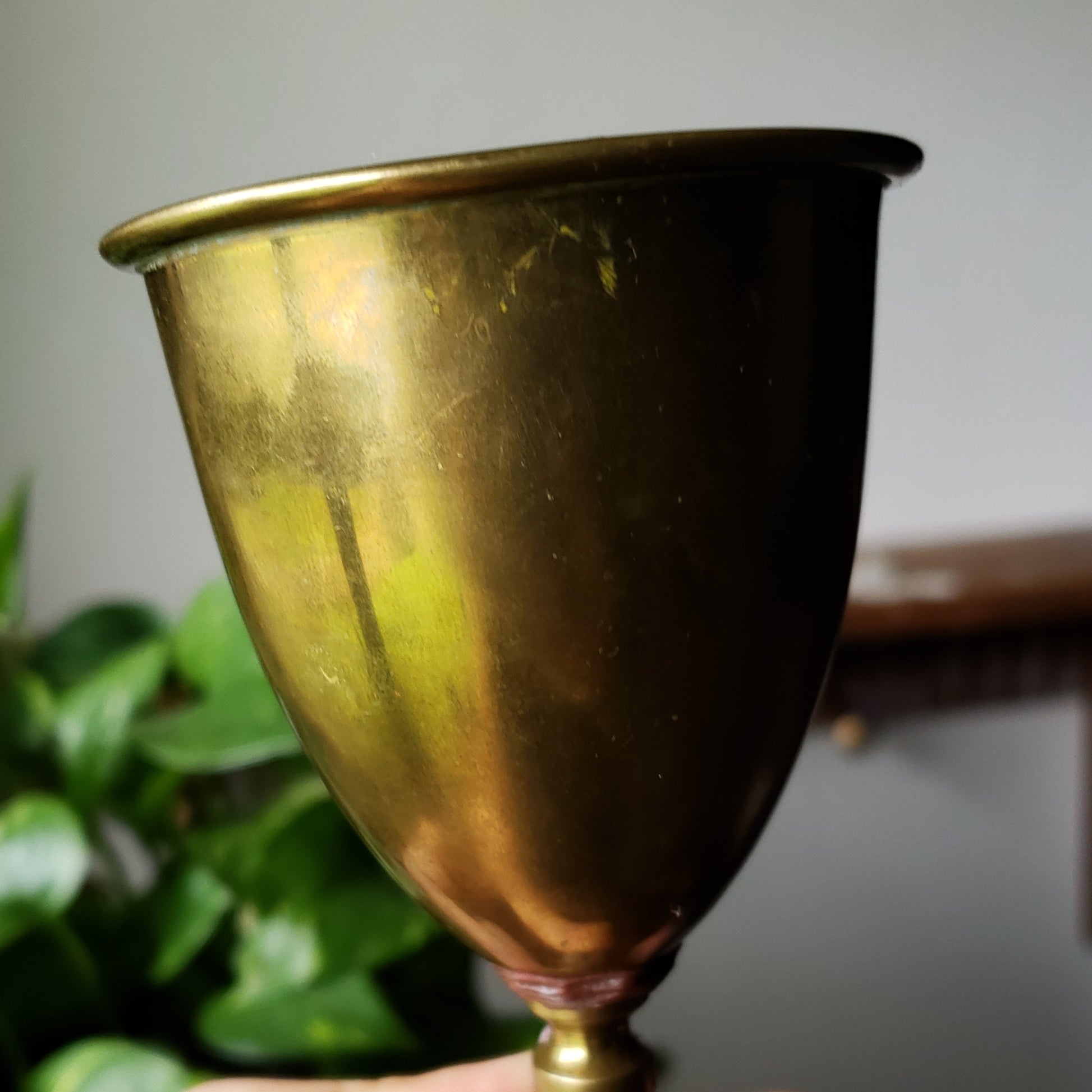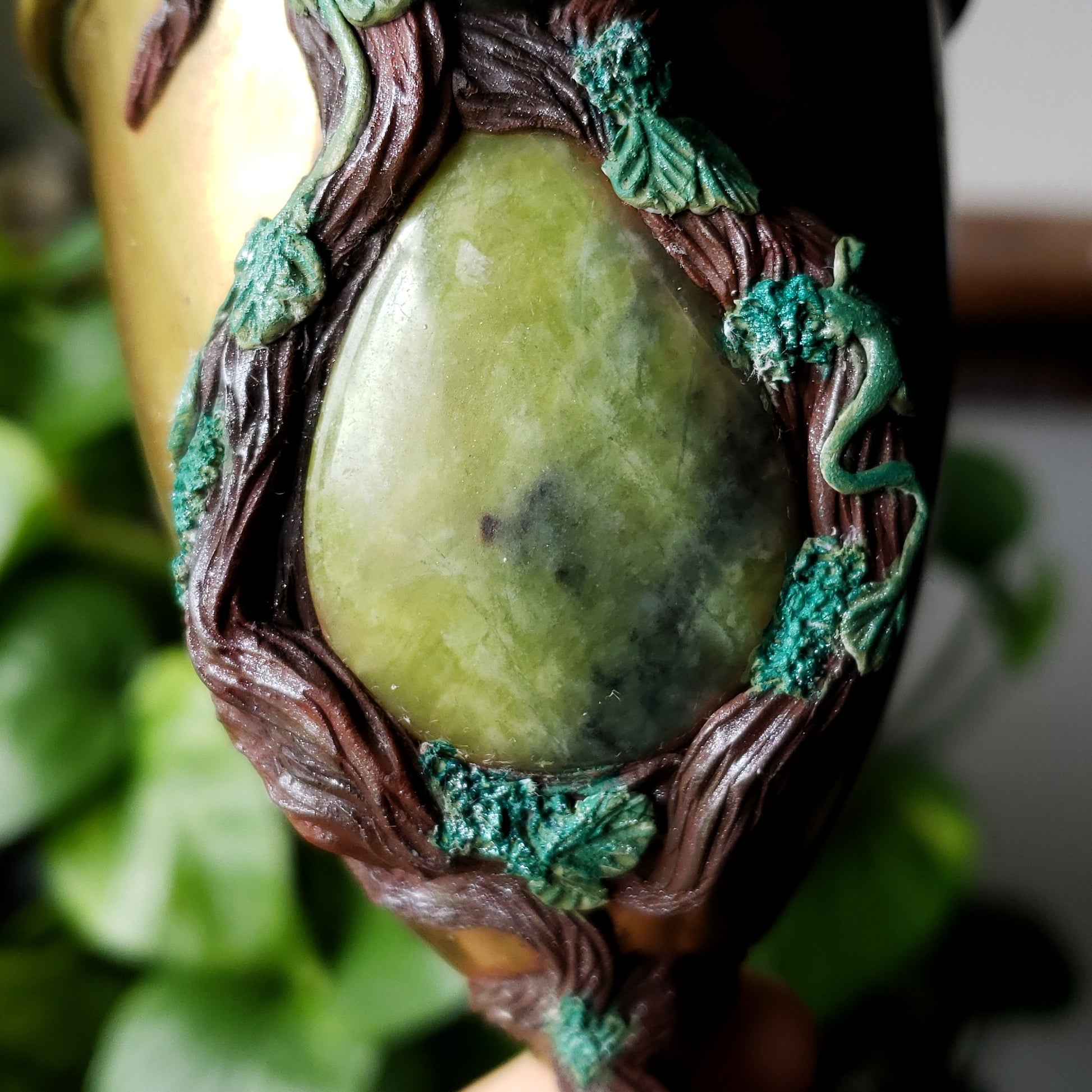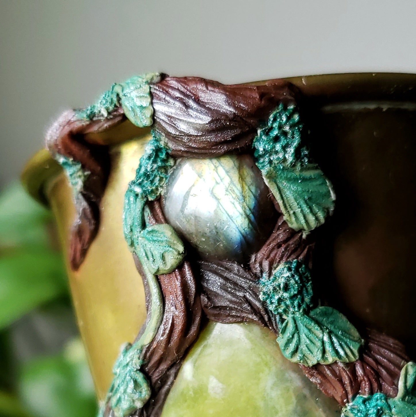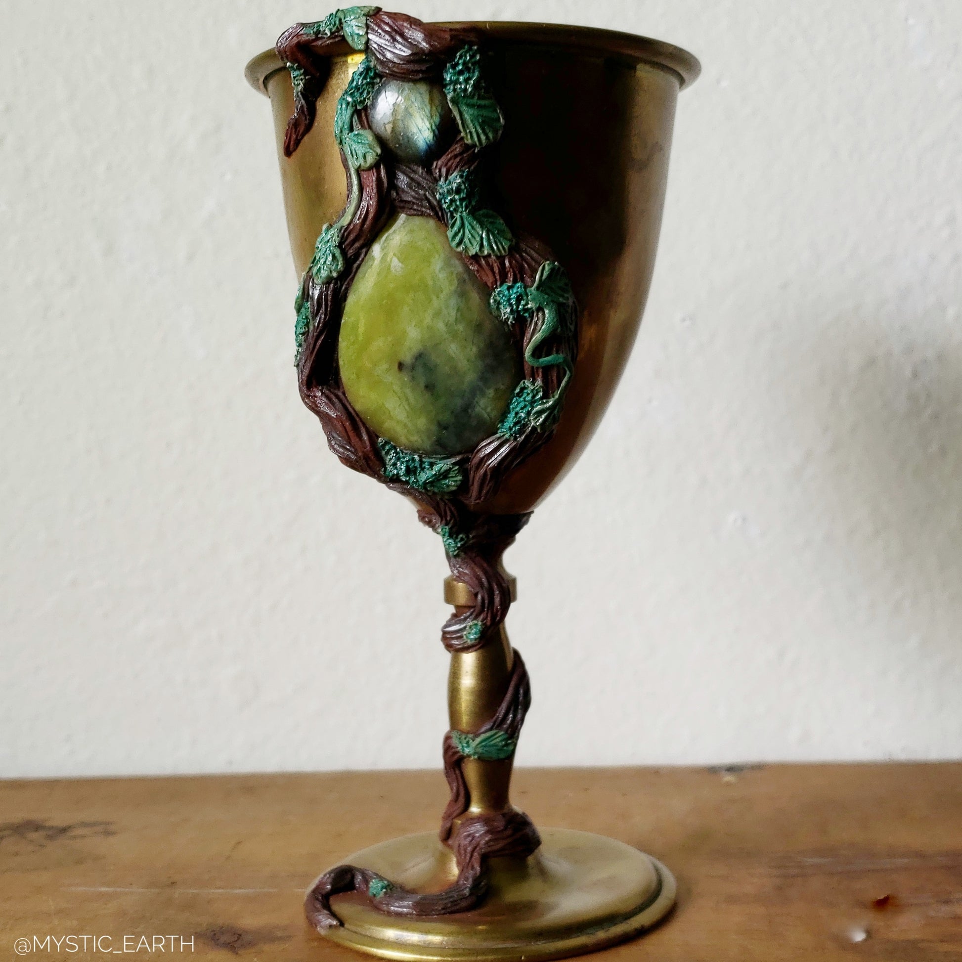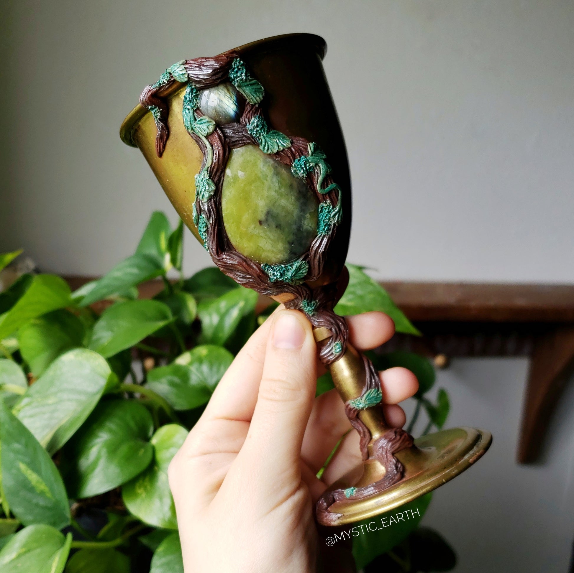 The Earth Elemental Chalice. A vintage brass chalice with a hand sculpted woodland design adorned with labradorite and serpentine crystals. Due to the vintage nature of the goblet there is a bit of inside damage, shown in the photos above, making it unsuitable for drinking out of. Use it as a crystal sphere holder, herb container, decoration, or for potions, rituals, and more.
