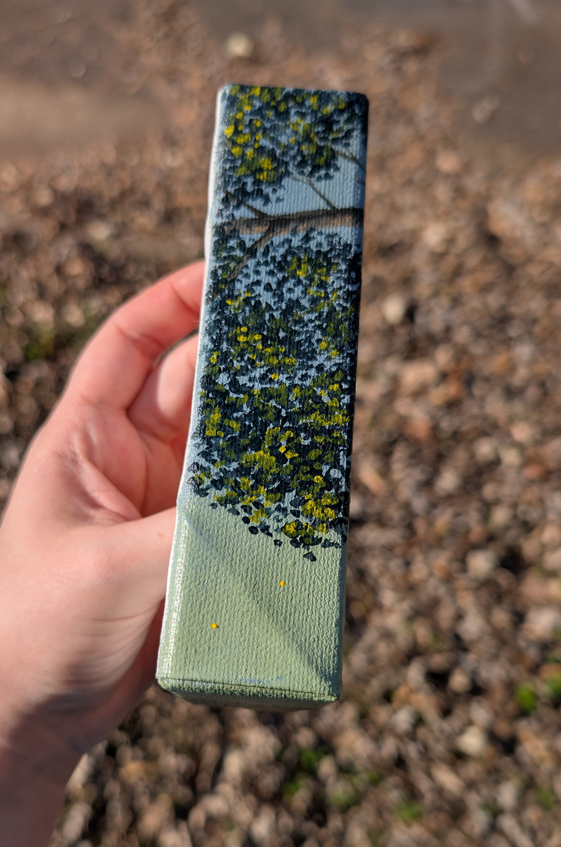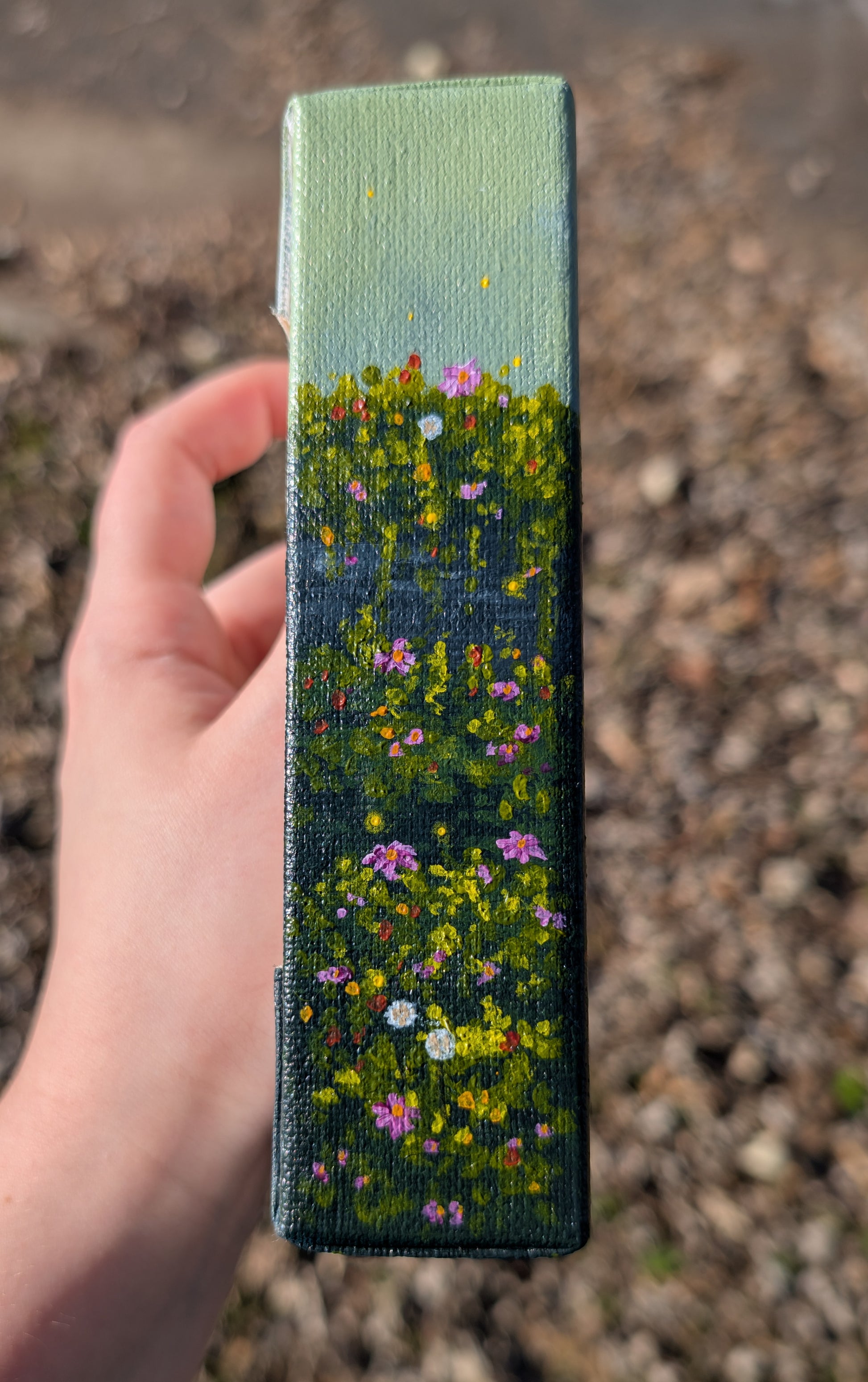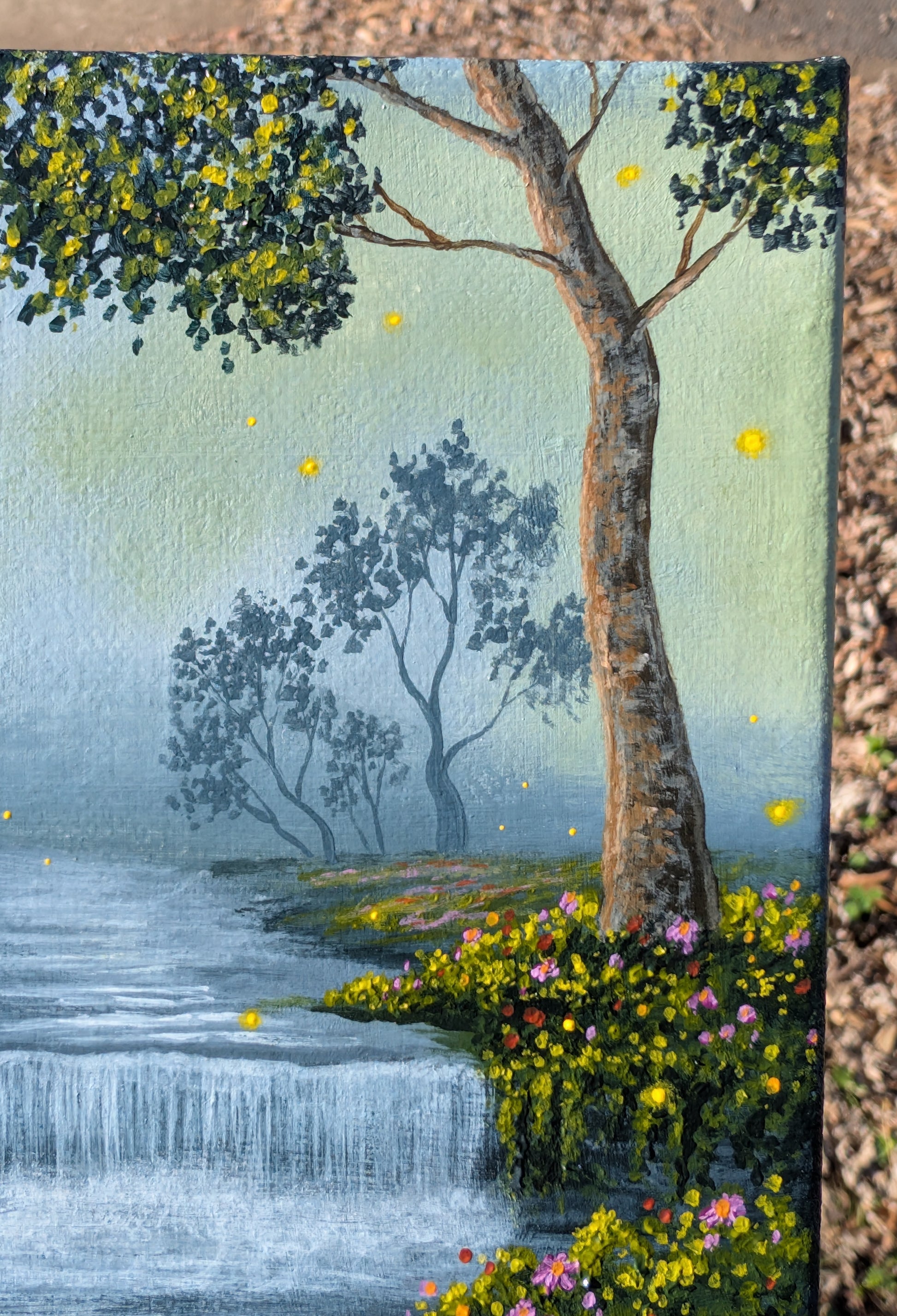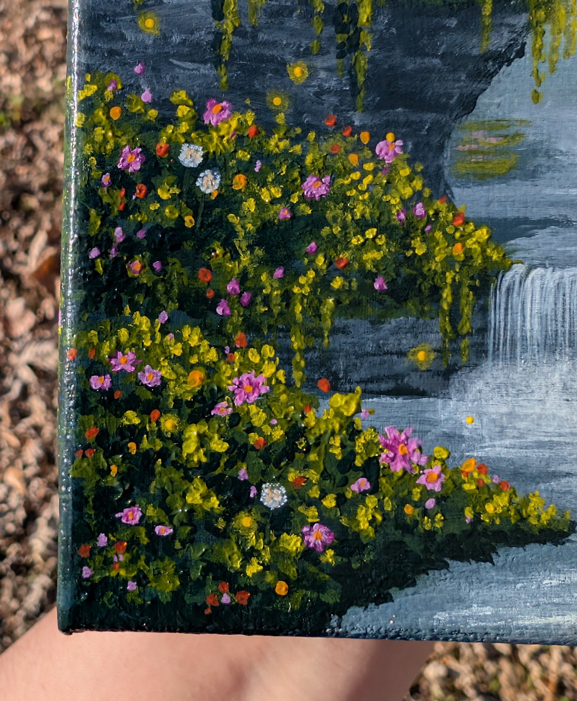 DESCRIPTION: I hand paint my designs with high quality acrylic paints that create vivid saturation and a crisp finish. The piece is sealed with two layers of matte varnish to protect the paint over time. It also adds a gorgeous sheen and cohesive finish to the piece! Hang by tack or nail with no framing needed, the canvas is wood paneled meaning theres 1" of space built into the back to hang on a wall with ease. The piece has been signed and dated along the top of the canvas.