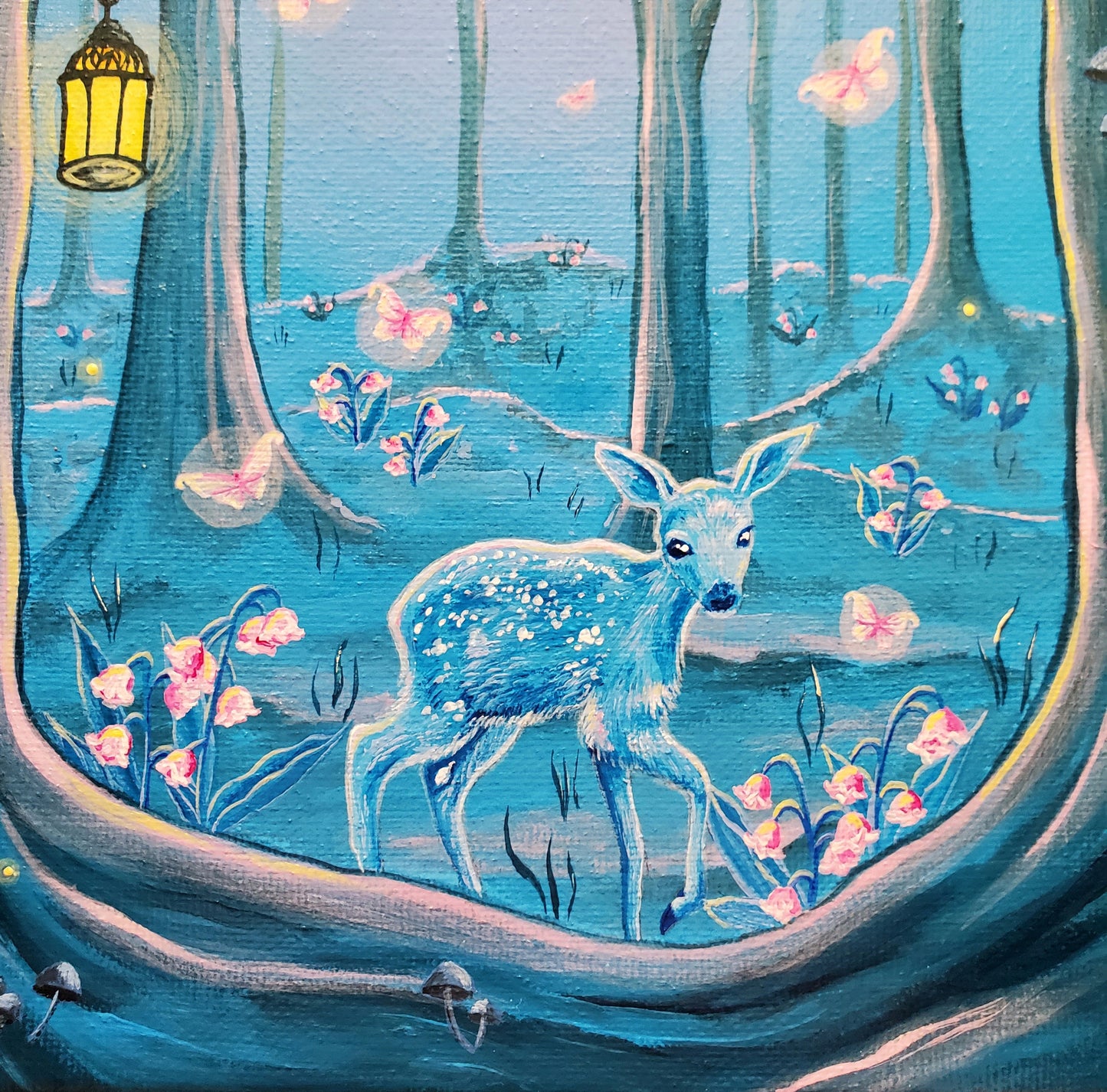 Fairy Forest Deer Painting: done on wood paneled cotton canvas with acrylics! This piece depicts a blue-toned magical forest filled with trees, fairies, lightening bugs, and lilly of the valley flowers. In the bottom center of the painting stands a deer spirit looking out through the trees. The scene extends over all four edges of the canvas!