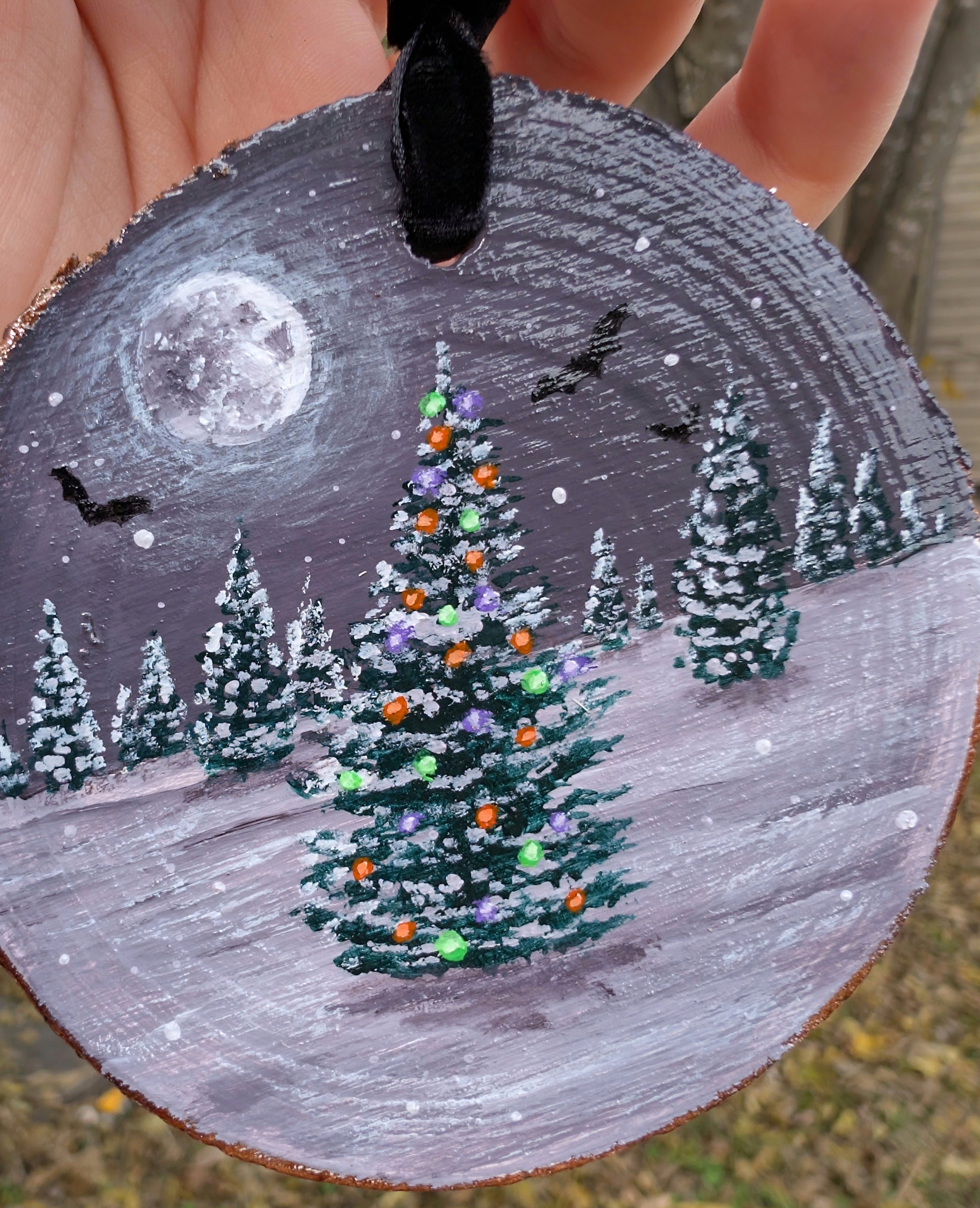 Gothic Christmas Tree Ornament or Wall Art Set: Original acrylic paintings on pine wood slices.