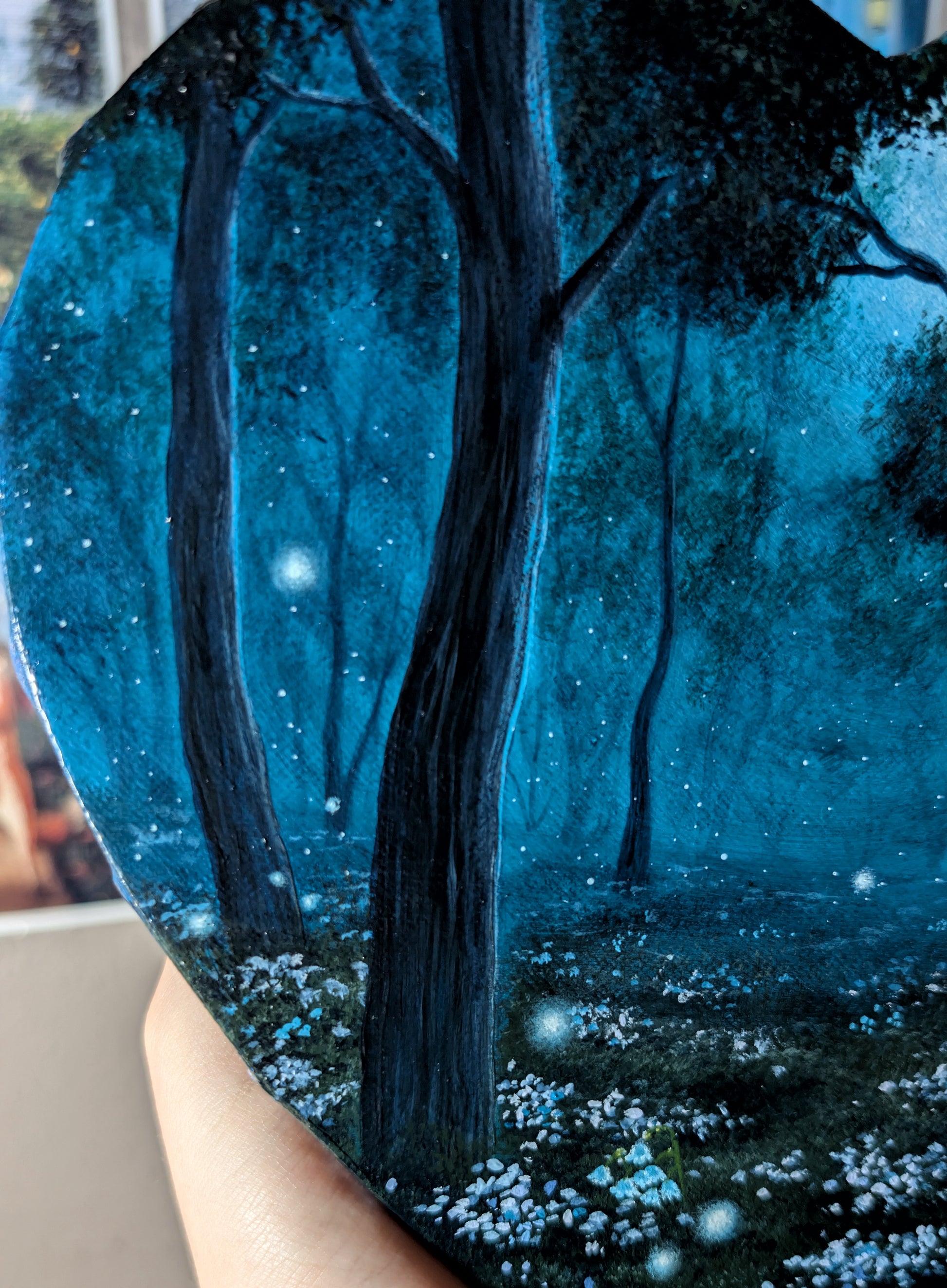 "In the Forest of Spirits" Painting: Acrylic on stretched heart-shaped canvas