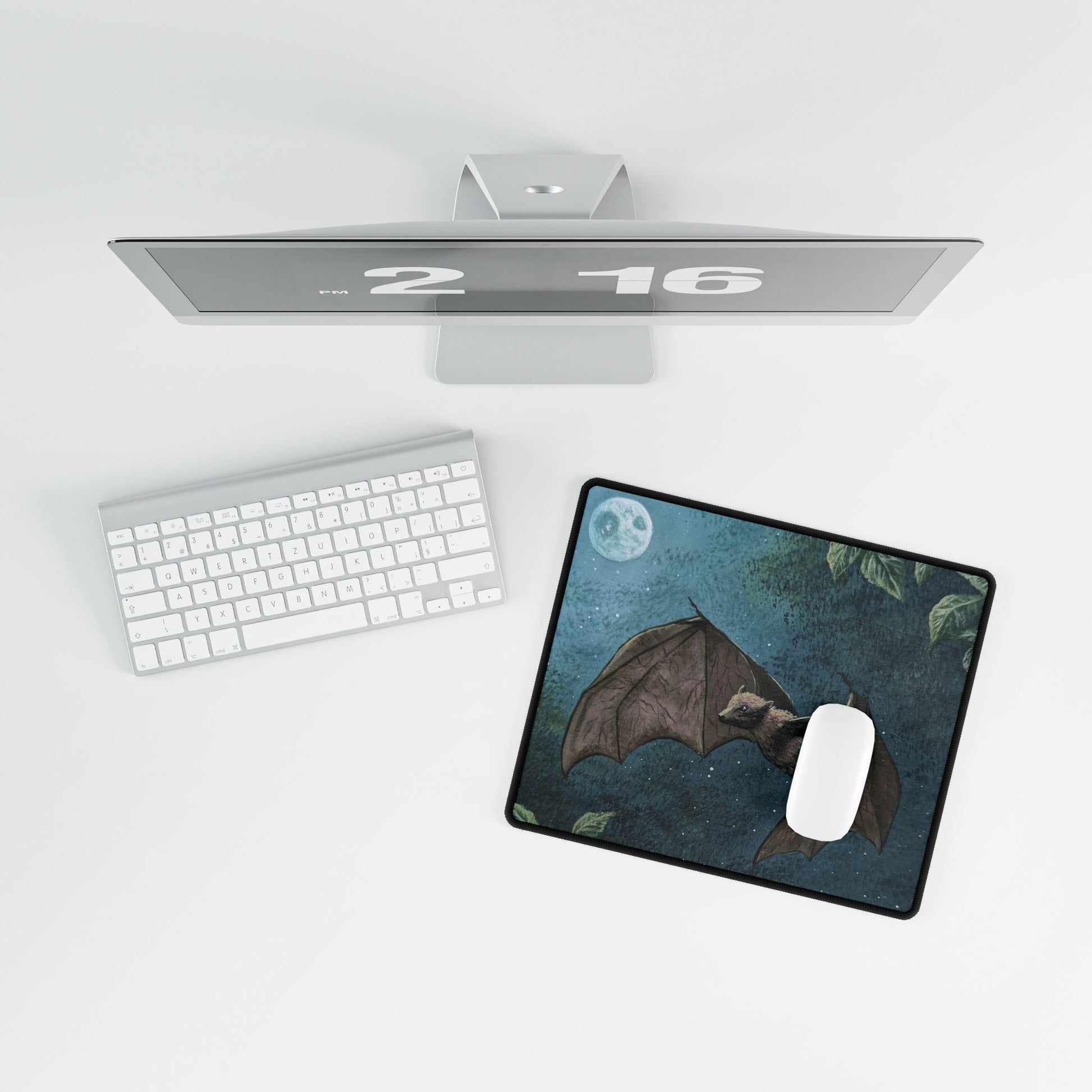 Desktop PC Mouse Pads in 1 size, printed with my acrylic painting "Nocturnal." Featuring a bat flying through the night sky.