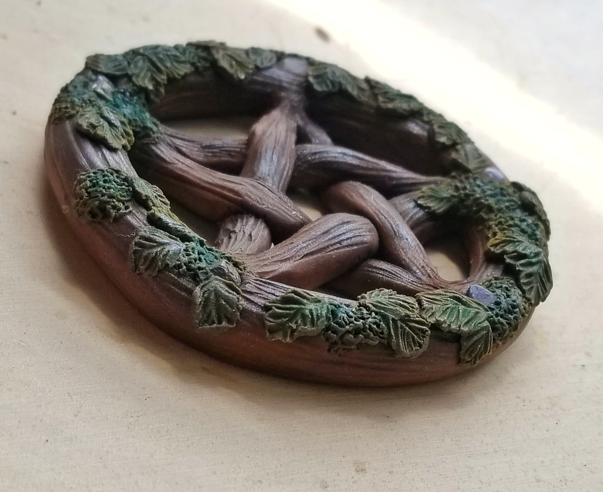 The Pentacle ~ a pentagram enclosed in a circle, symbolizing protection and the elements of spirit, air, earth, fire, and water. This will come as a small sculpture (intended to be an altar tile, but can be used just for decoration or other purposes!), or as a wall hanging decoration with silver chain!