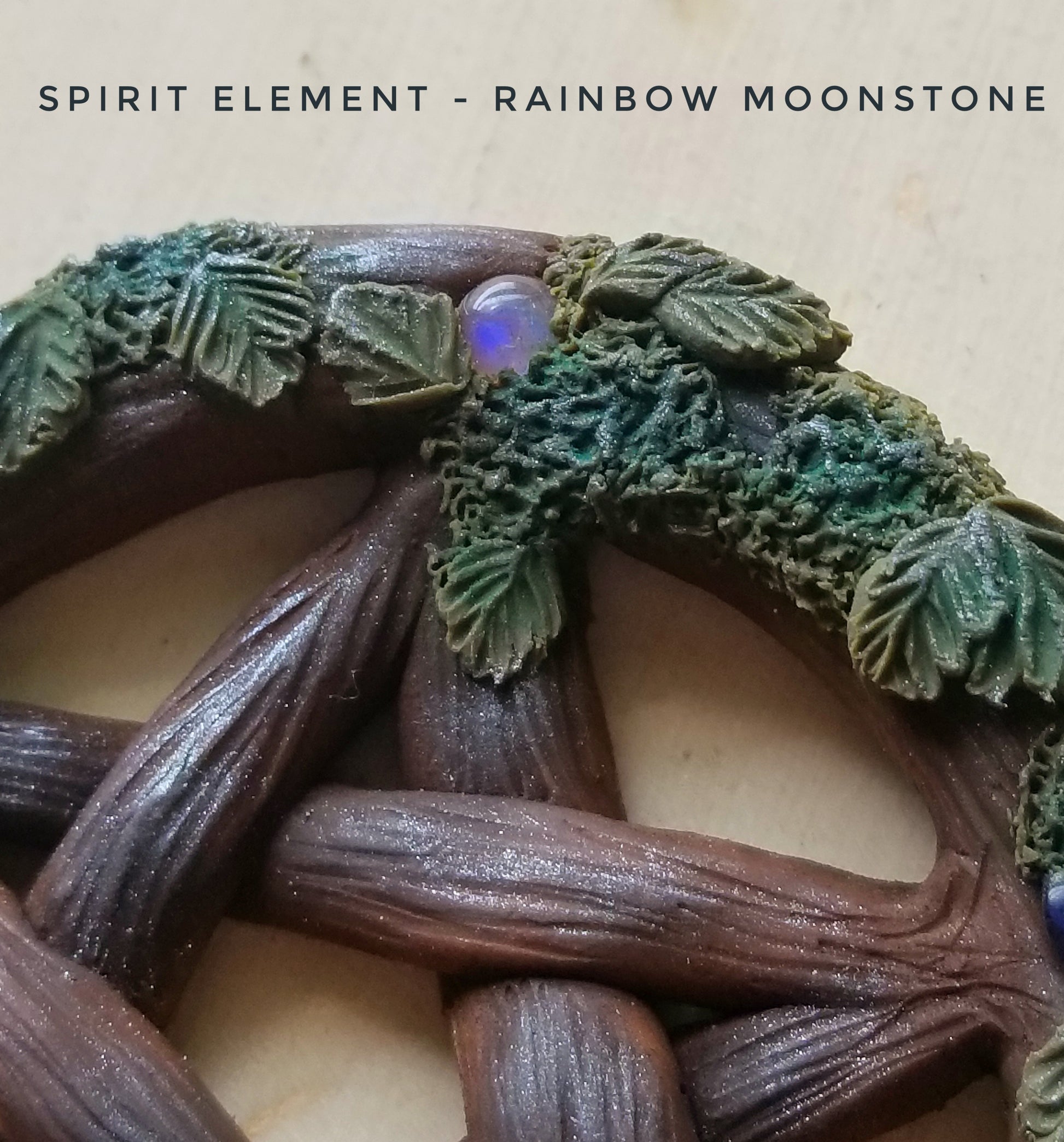 Spirit ~ Rainbow Moonstone. Air ~ fluorite. Earth ~ peridot Fire ~ garnet. Water ~ lapis lazuli.