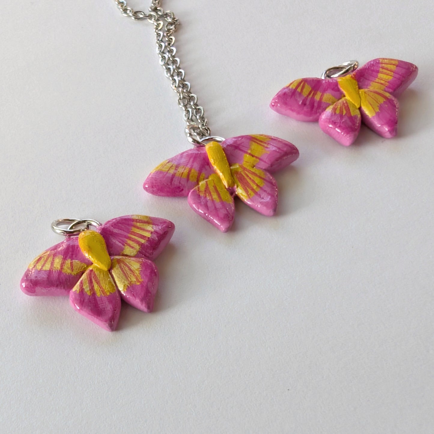 Hand Sculpted Rosy Maple Moth Necklaces - embedded with metal supports and sealed with gloss varnish