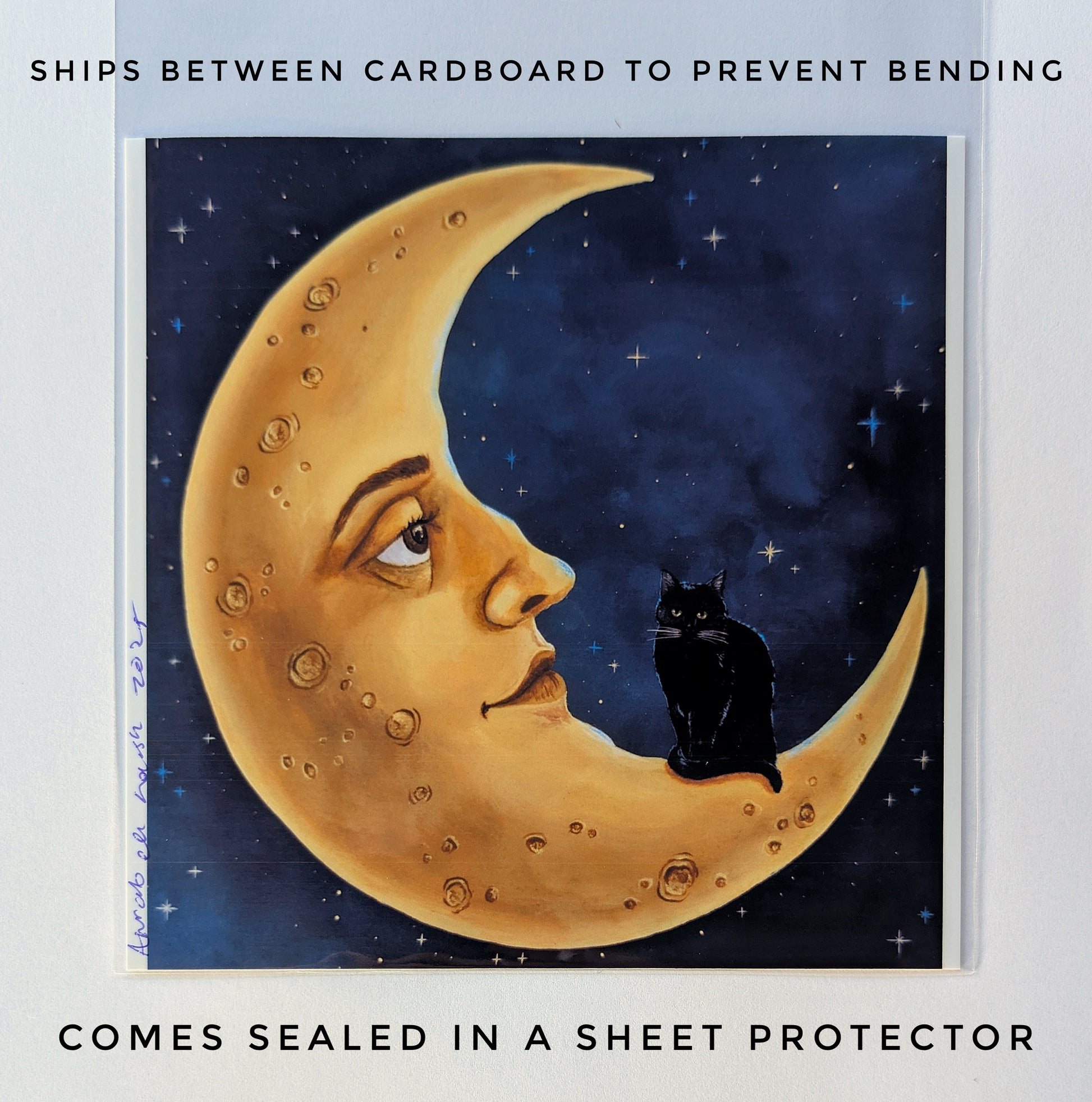Gloss finish prints of "The Cat on the Moon," acrylic painting by Annabell Larsh (me). Inspired by 90s and early 2000s celestial artwork.